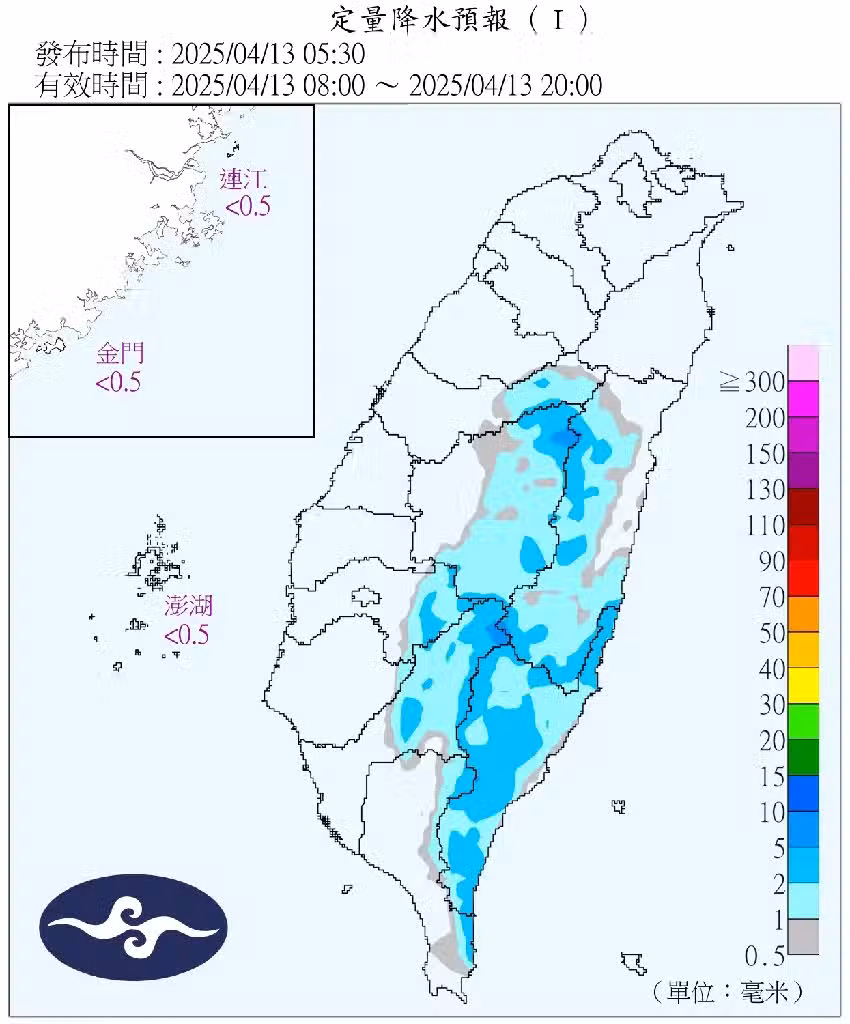 氣象署說,周六晚至今晨鋒面通過,各地都有陣雨及雷雨,西半部許多縣市都有短延時強降雨及局部大雨,桃園更有局部豪雨,最大時雨量在嘉義縣義竹鄉達78毫米,最大3小時雨量在桃園市中壢區達104毫米;白天鋒面遠離,降雨明顯減少,剩下花東及中南部山區仍有局部短暫雨。
