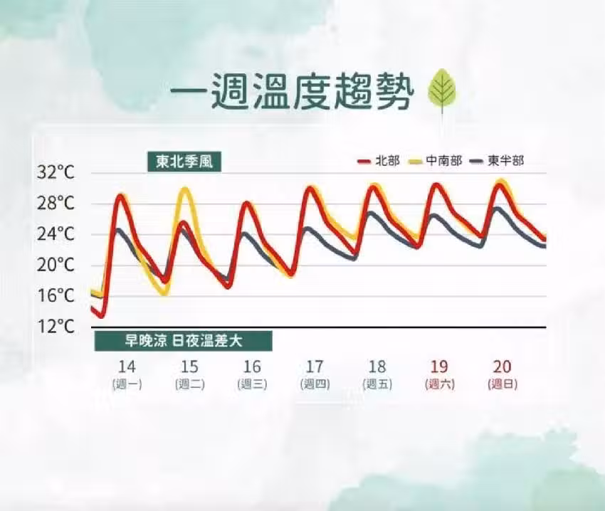 白天氣溫方面仍維持在相對溫暖的水準,北部及東部高溫約攝氏26至29度,中南部則介於27至31度之間,部分內陸地區甚至可能突破32至34度。