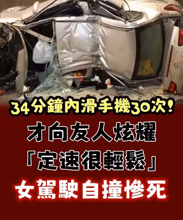 快訊/34分鐘內滑手機30次!才向友人炫耀「定速很輕鬆」 女駕駛自撞慘死