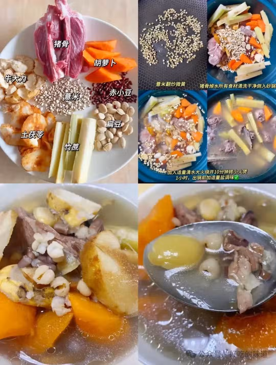 這道湯香氣四溢,既能健脾又能祛濕。五指毛桃和土茯苓的藥用價值很高,和排骨一起燉煮,營養豐富。但孕婦和哺乳期婦女要忌口,正在服用藥物的人群也應避免食用,以免發生藥物相互作用。