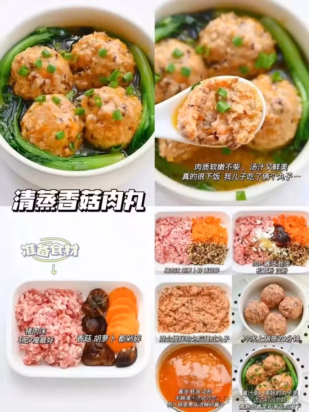 準備食材:豬肉餡,香菇,胡蘿蔔,蔥姜,醬油,蚝油,鹽,澱粉,松茸粉,青菜。