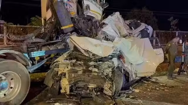 不料,一輛重型18輪拖車因天色昏暗、視線不良,駛入緊急車道時未能及時剎車,猛烈撞上休旅車。