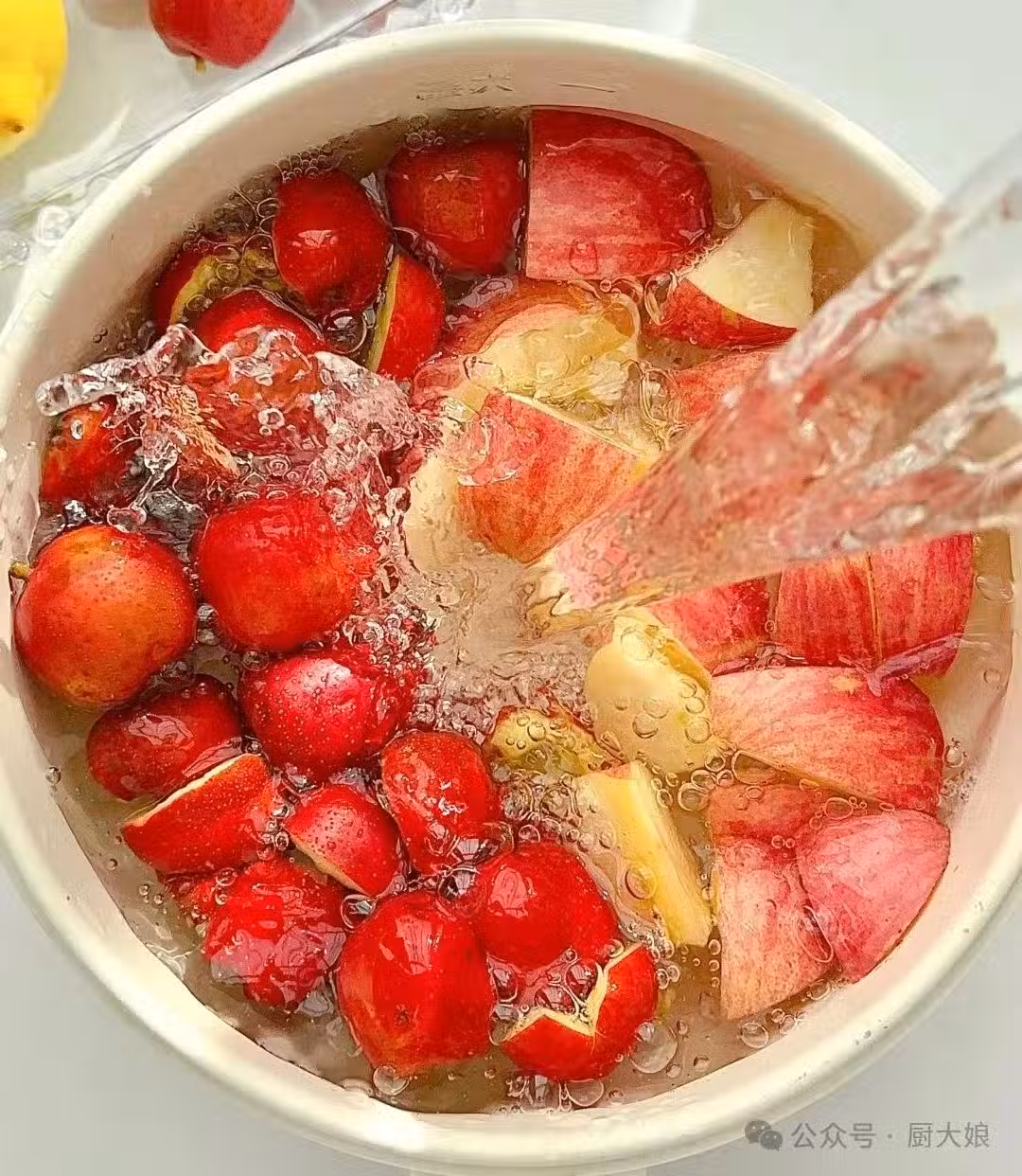 🍳做法 1️⃣ 將蘋果、山楂、紅棗洗凈備用 2️⃣ 蘋果切成小塊,山楂去核,紅棗去核 3️⃣ 將蘋果、山楂、紅棗放入鍋中,加入適量清水,大火煮沸後轉小火煮15分鐘左右 4️⃣ 加入適量冰糖,繼續煮5分鐘即可