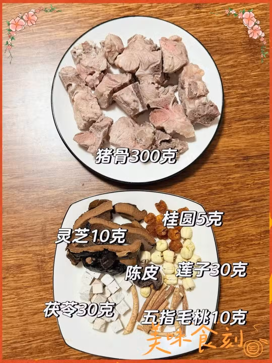 豬骨500克、紫靈芝15克、桂圓肉15克、五指毛桃20克、茯苓15克、蓮子15克、陳皮5克、