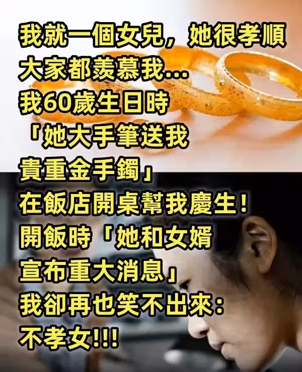 我就一個女兒,她很孝順大家都羨慕我… 我60歲生日時「她大手筆送我貴重金手鐲」在飯店開桌幫我慶生!開飯時「她和女婿宣布重大消息」我卻再也笑不出來:不孝女