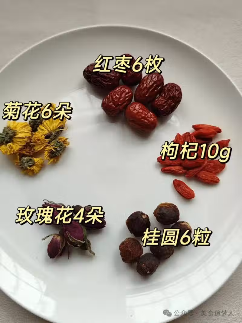 食材:玫瑰花、菊花、桂圓、紅棗、枸杞