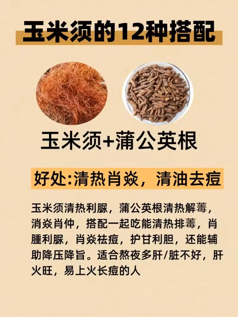 8. 玉米須+蒲公英根:蒲公英根清熱解毒,組合起來,消炎去火 。