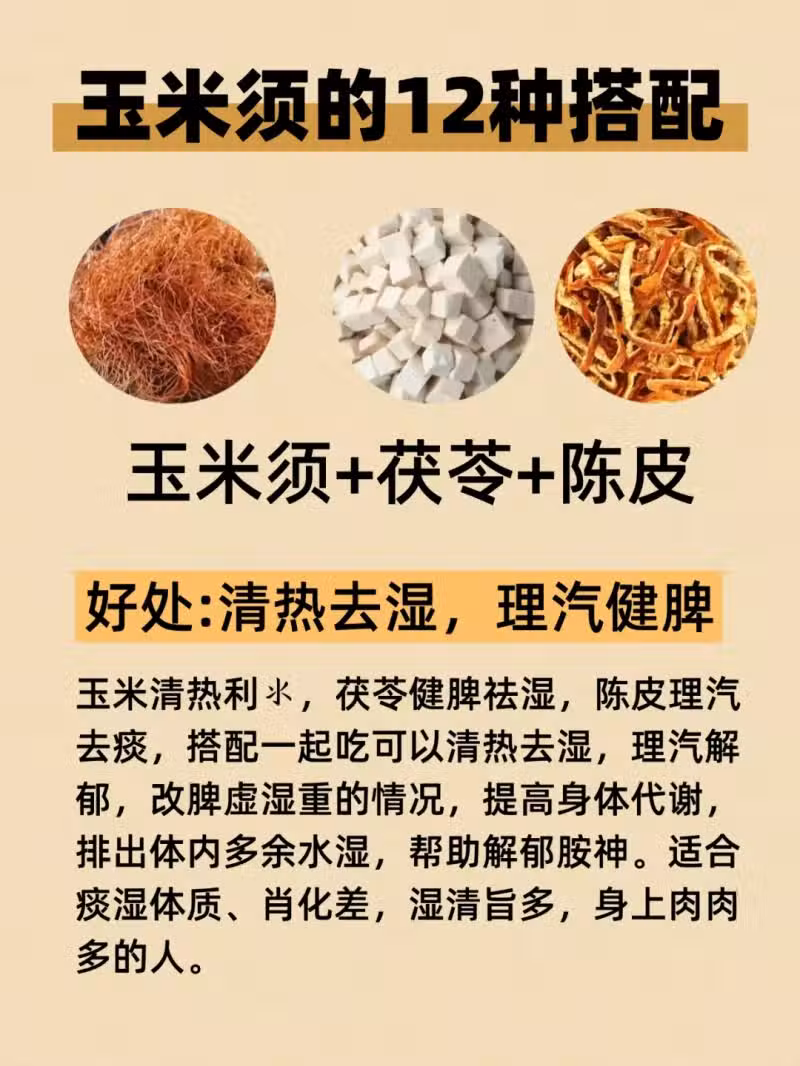 9. 玉米須+茯苓+陳皮:茯苓利水滲濕,陳皮理氣健脾,一起調理脾胃 。