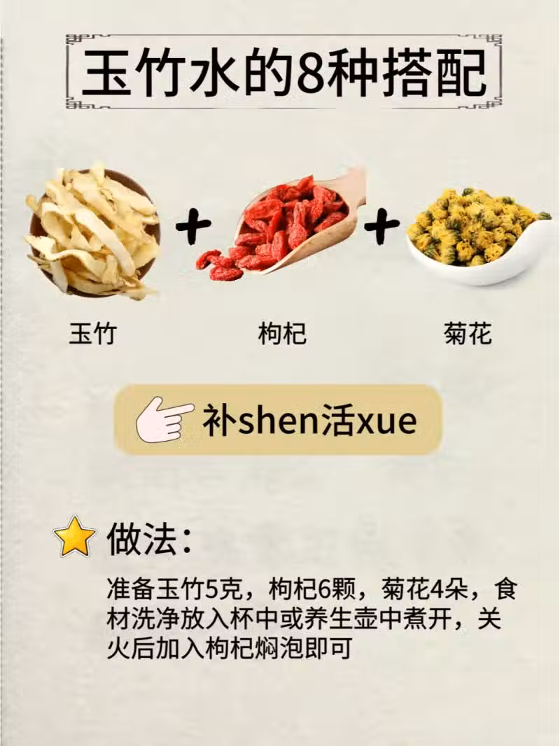 3. 玉竹+枸杞+菊花:滋補肝腎的黃金搭檔,讓你的身體活力滿滿,氣血暢通 。