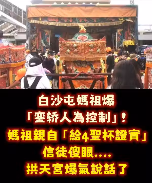 苗栗白沙屯媽祖一年一度的進香活動在27日圓滿結束,不過,卻有一個YouTube頻道爆料,拱天宮的神轎「粉紅小超跑」會自己控制方向只是噱頭,事實上是人為控制,全都是在自導自演,還出示連續擲出4聖杯畫面加以證實。