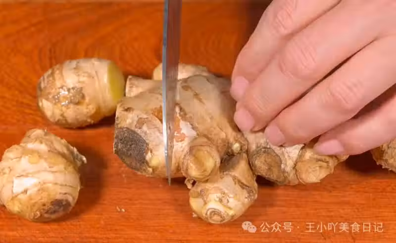 切塊:將生薑置於砧板,用刀在關節處切斷,切成3-4厘米見方的塊狀。保留部分姜皮,因姜皮性涼,可平衡姜肉辛熱,避免上火。