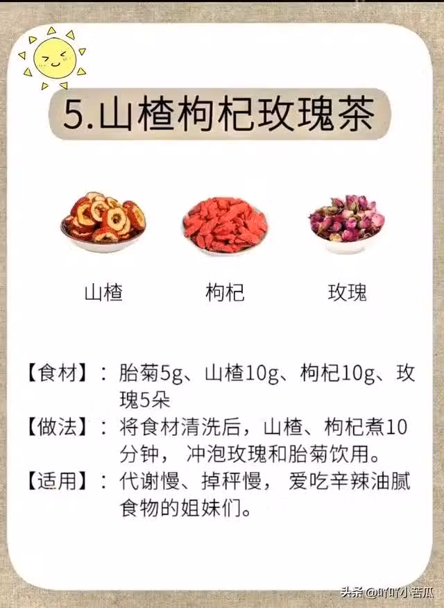 喝法:山楂枸杞煮10分鐘,泡玫瑰胎菊。