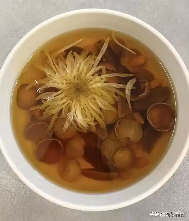 7粒帶殼干桂圓洗凈(殼、肉分開),4顆紅棗去核剪片,配上5g枸杞子、2朵菊花,