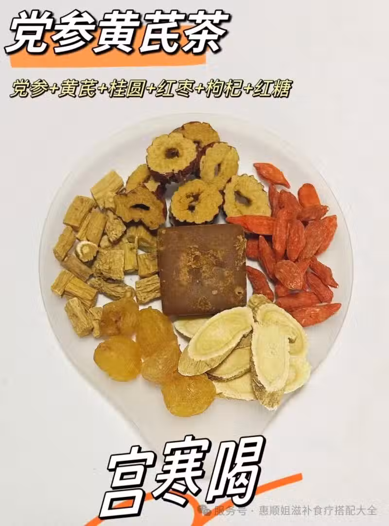 紅棗3顆+桂圓4個+枸杞1把+黨參3克+黃芪3克+紅糖1塊