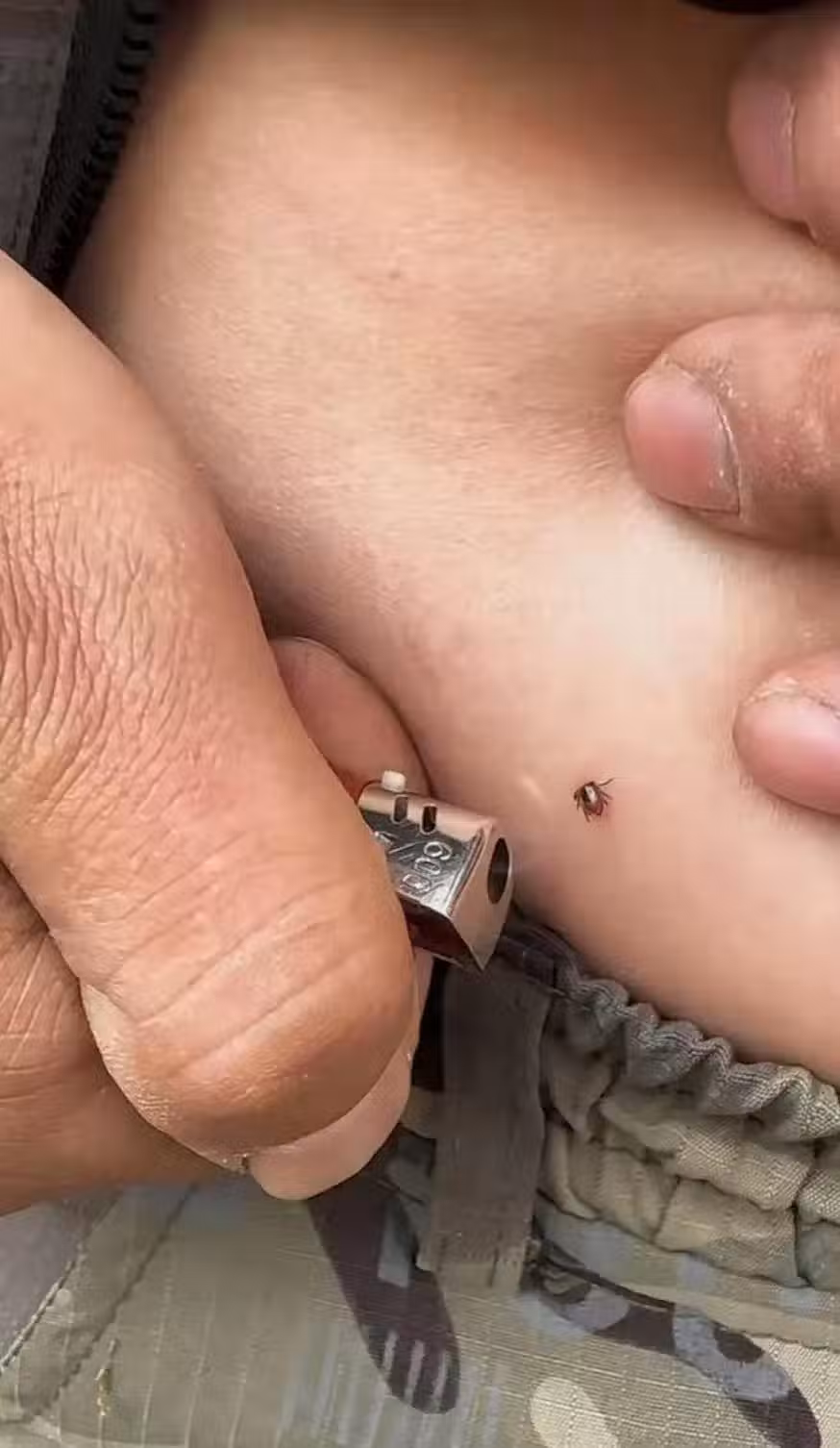 媽媽趕緊拿手機的手電筒來一照,發現好像不像是痣,用手去摸,感覺還凸起來的,陳媚就想起來這應該是蜱蟲,她就跟老公說這應該是蜱蟲,我之前刷視訊就刷到過。老公就說:哎呀,這就是草爬子嗎?我聽家裡面的老人說就拿煙頭來燙一下,或者拿火來燒一下就可以了。陳媚趕緊阻止說:用火燒,萬一刺激這個蜱蟲更往裡面鑽多一點,不行的,而且還可能會燙到孩子的皮膚。老公就說:那就直接用手把它拔出來吧。陳媚趕緊又拒絕老公這個魯莽的做法,她說:用手更加不可以,醫生已經說了蜱蟲的口器是有倒鉤的,如果用手拔出來這個頭很容易殘留在裡面。