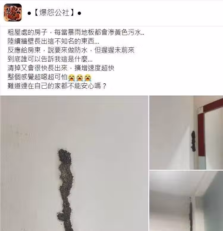 近期梅雨季到更是避不過,不料,最近牆壁還接連冒出詭異的「黑色條狀物體」,不論她怎麼清掉還是會長出來,更可怕的是,再次長出來後,擴增速度比之前還快,無奈發問:「到底誰可以告訴我這是什麼…」