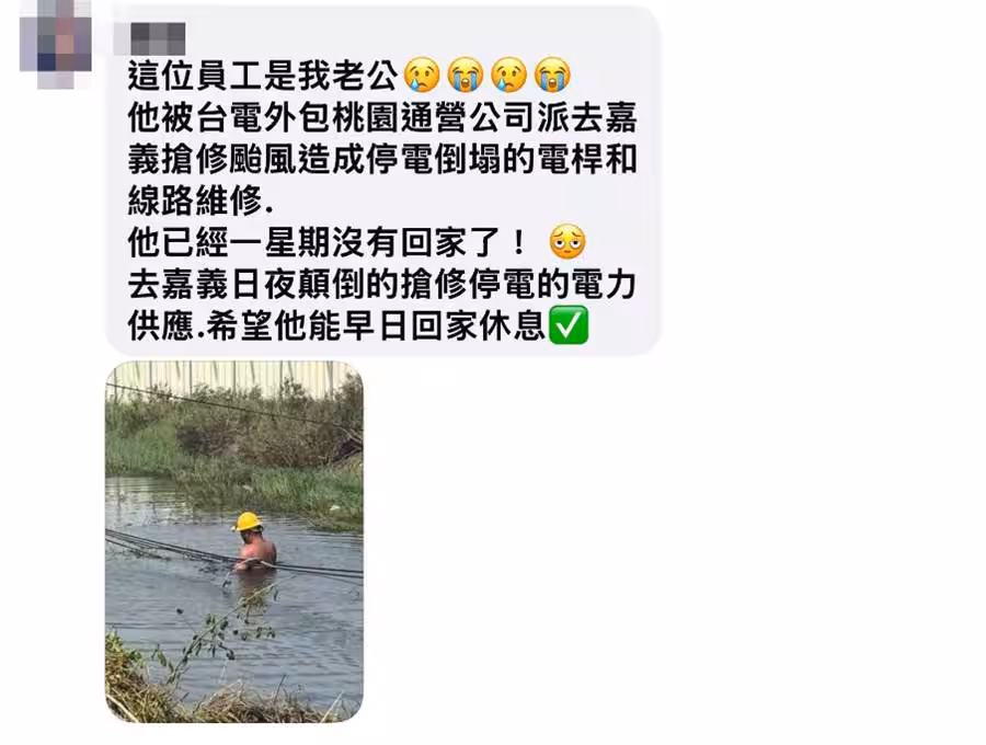 他已經一星期沒有回家了,去嘉義日夜顛倒地搶修停電的電力供應,希望他能早日回家休息」,文中以哭泣的表情符號表達擔心、心急的心情。