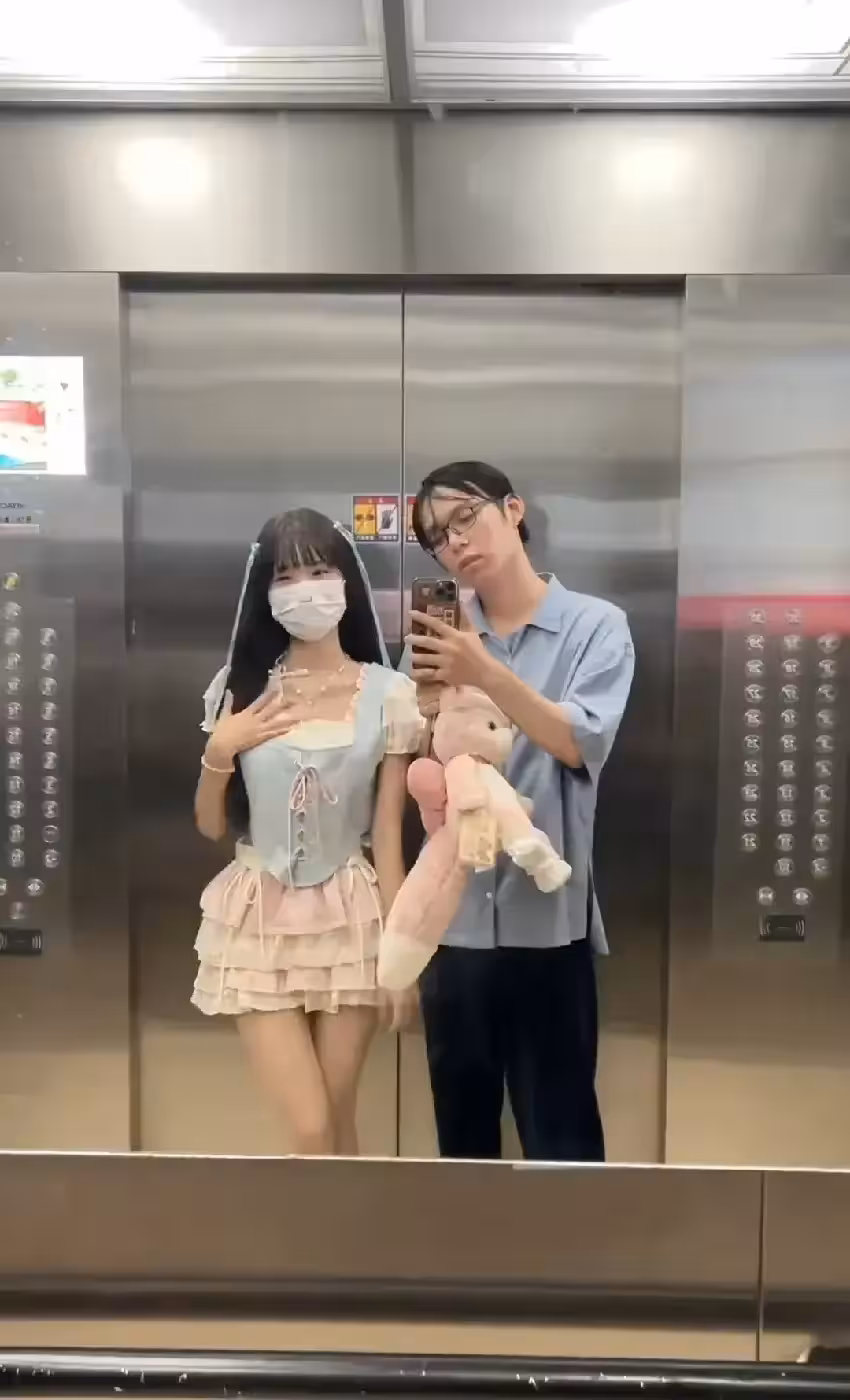 這對情侶喜歡在電梯里拍照,對著鏡子擺姿勢,這已經成為他們的特色。