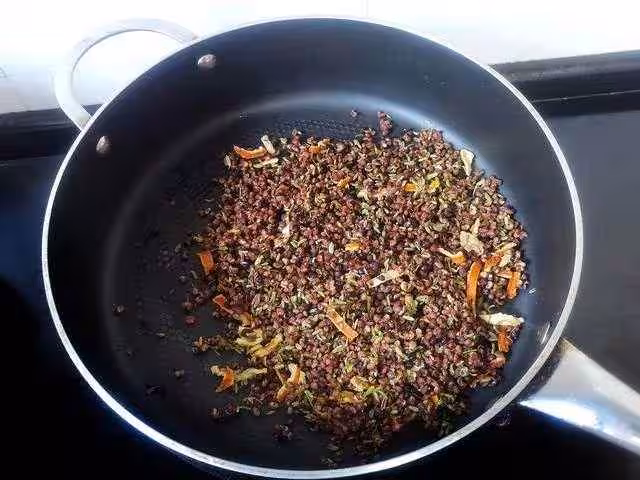 3、將洗乾淨的香料倒入鍋內,開小火慢炒,把水分炒干,這一步可能比較耗時,