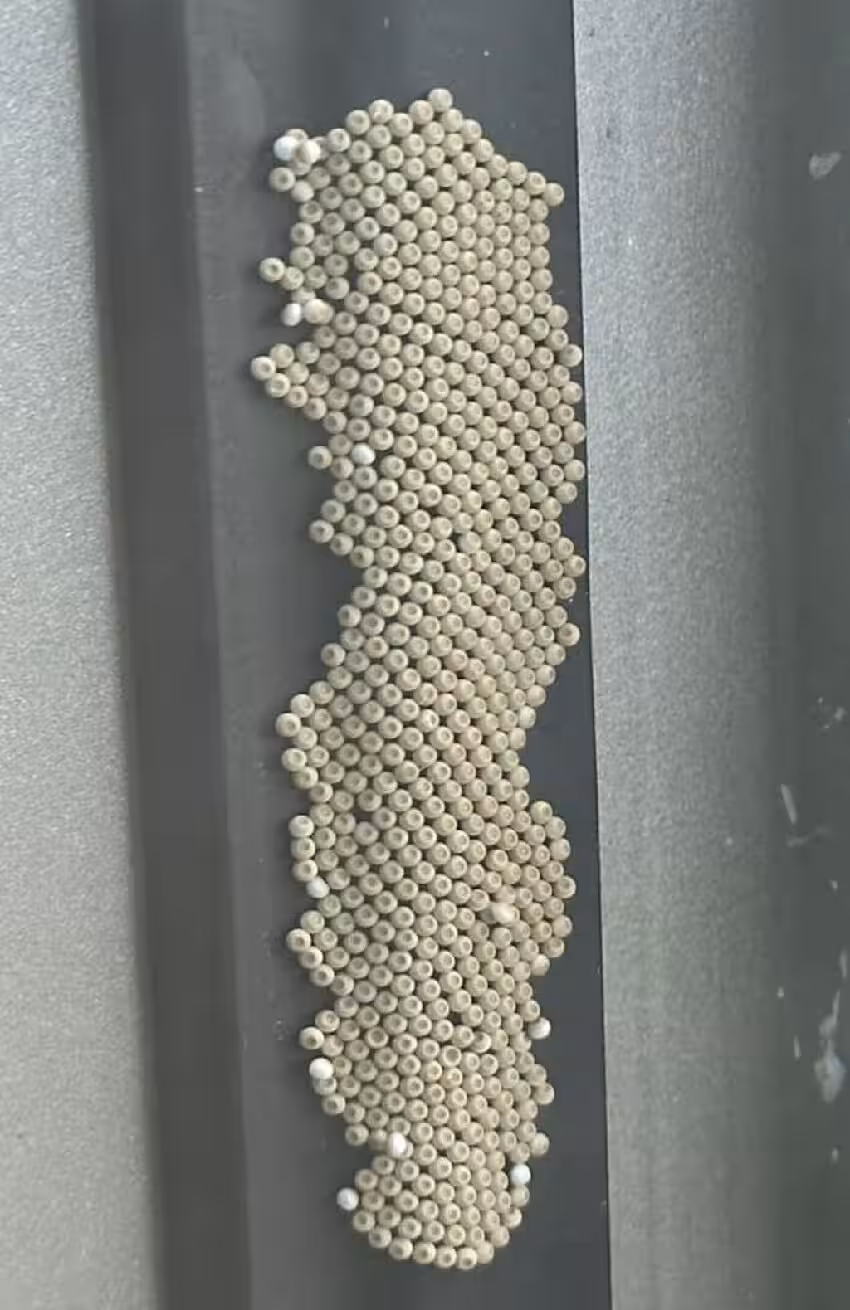 根據原PO所分享的照片,這些蟲卵呈白色、體形細小,全都聚集在一起,密密麻麻地黏在窗框上。
