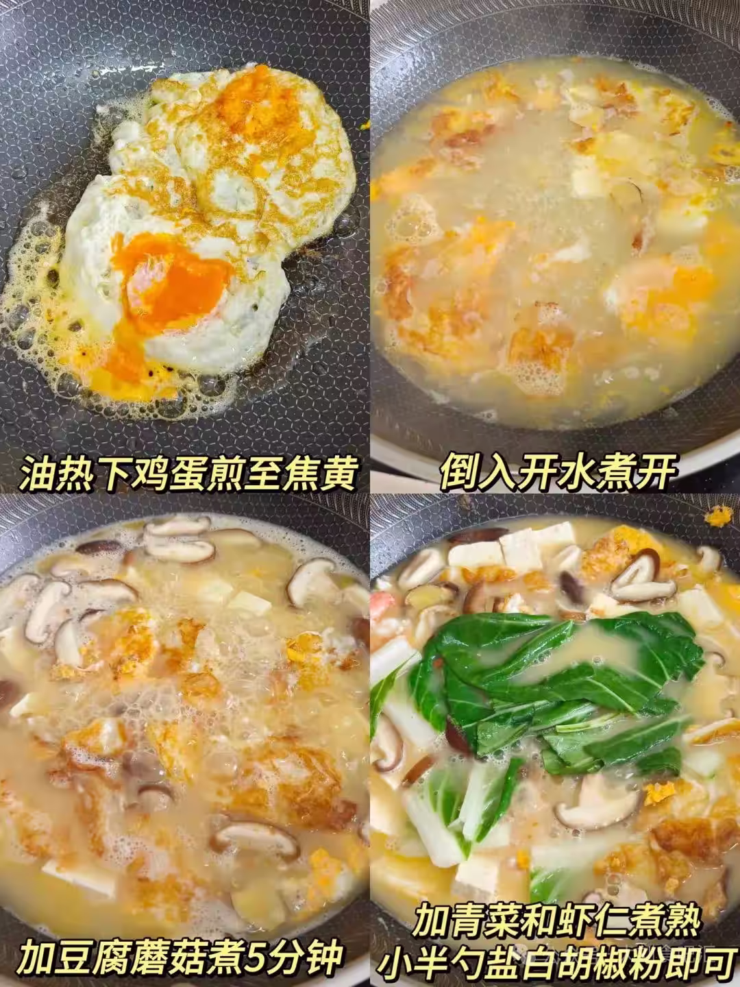 雞蛋、香菇、豆腐、青菜、蝦仁、鹽、白鬍椒粉