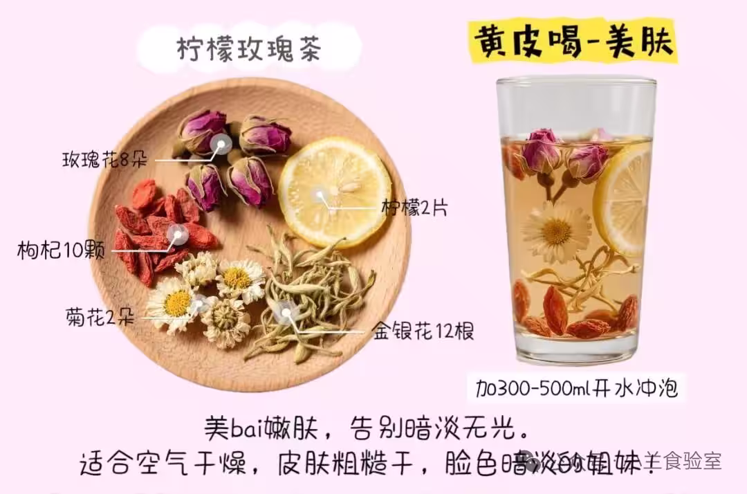 配方:玫瑰8朵 + 枸杞10顆 + 金銀花12根 + 菊花2朵 + 檸檬2片