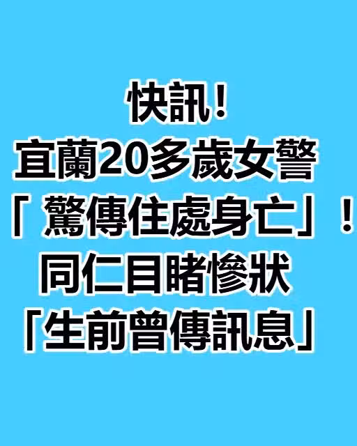 根據《ETtoday新聞雲》報導,宜蘭警界傳出令人悲痛的消息,一名警專第38期畢業、20多歲的王姓女警,日前在租屋處浴室內不幸猝逝,讓所有認識她的人都難以接受這個突如其來的噩耗。