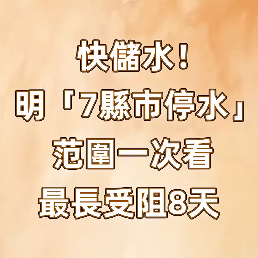 準備儲水!根據台灣自來水公司官網資訊,明(27)日基隆、新北、雲林、嘉義、台南、屏東、台東7個縣市中,有部分行政區將展開停水,時間長短不一,停水時間最長者在台南,從7月28日至8月4日,每天早上至下午都會暫時停水,提醒停水範圍區域內之用戶,請自行儲水備用。