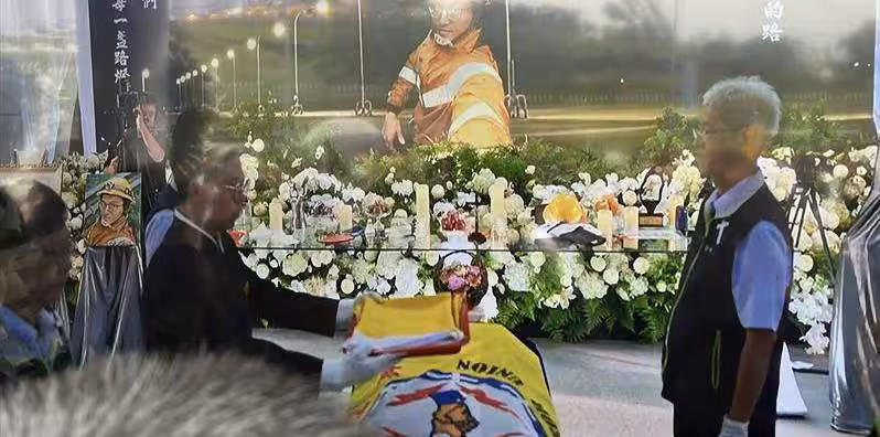 ▼▲李元瀚拼復電不幸殉職,棺木覆蓋台電會旗,以表其對台電奉獻,李妻接下褒揚令。