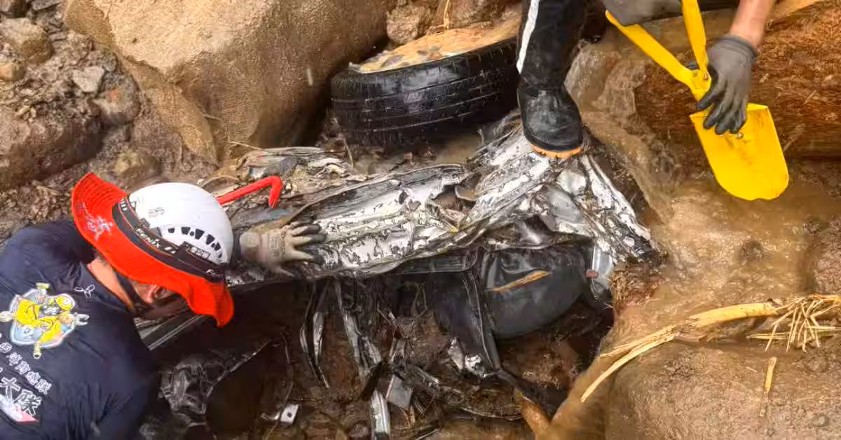一家五口墜谷意外,搜救人員尋獲車體。(圖/東森新聞)