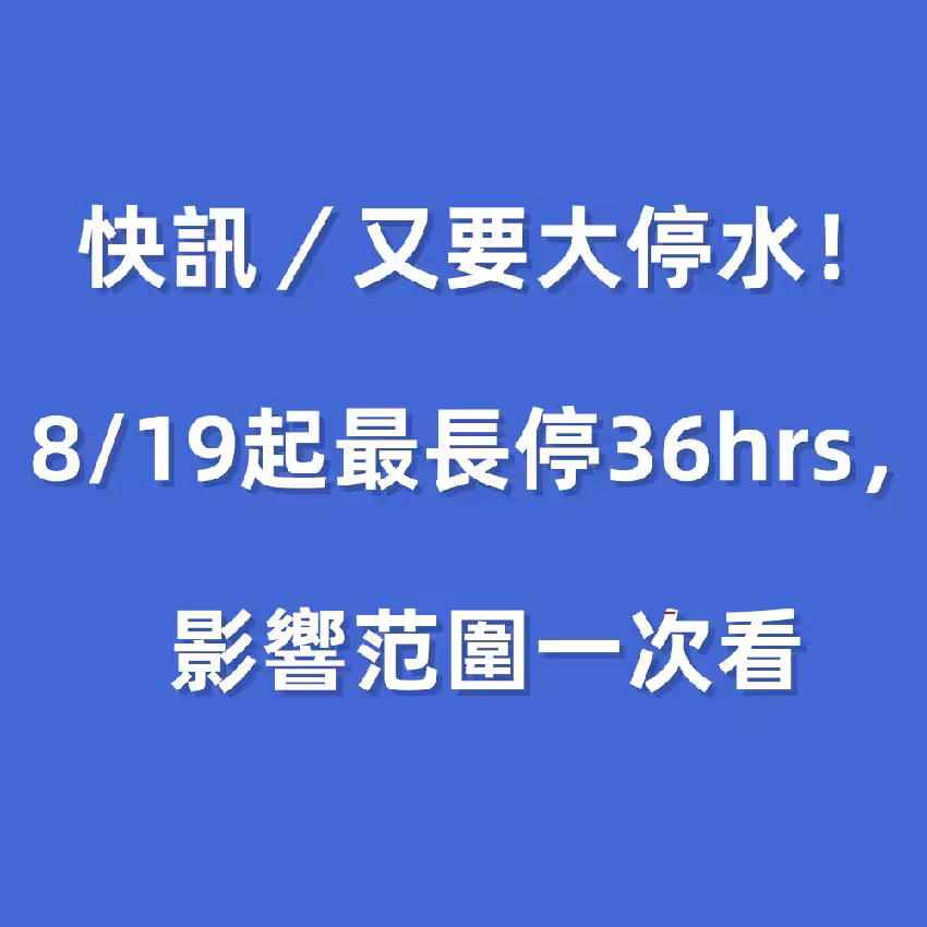 台中又要大停水!由於位在苗栗的導水管疑似破管,台灣自來水公司第四區管理處宣布將啟動緊急搶修作業,預計於8月19日(星期二)10時起至8月20日(星期三)停水,共計28至36小時,停水戶數約29萬8771戶,請市民提前儲水。