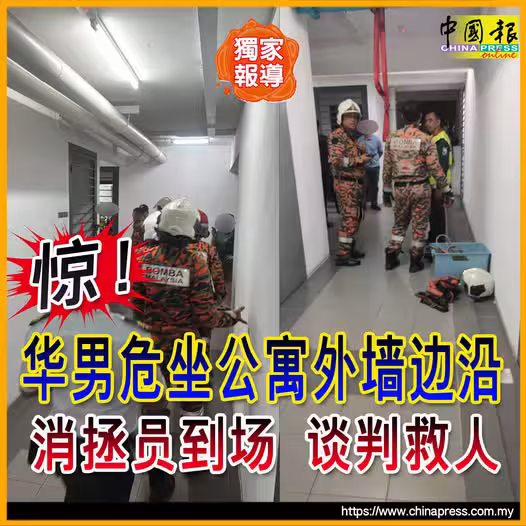 (吉隆坡17日訊/獨家報導)華裔男子疑想不開,危坐在公寓外牆邊沿處,消拯員目前已趕赴現場,展開救人行動。