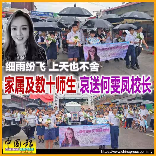 在何雯鳳校長舉殯的今日,天空陰霾低沉伴隨著細雨,仿佛也為她的不舍而哀悼。