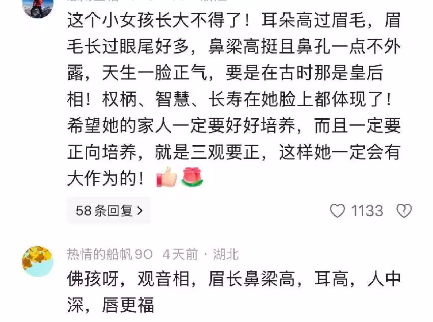 有網友就注意到了這一點,說她耳朵比眉毛高,眉毛又比眼尾長,鼻樑高挺,天生一副正氣模樣,在古代就是母儀天下的「皇后」面相,這家人一定要好好培養她的三觀。