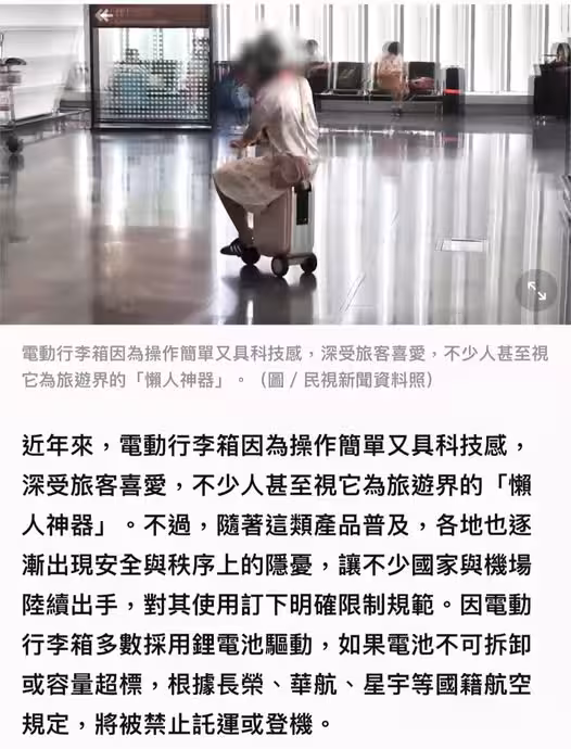 電動行李箱的禁令並非桃園機場獨有政策,在國際間,許多地方也已對其進行限制。