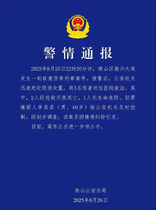 景德鎮市珠山公安分局26日通報,警方趕到現場後迅速將3名傷者送醫,其中2人搶救無效身亡,1人無生命危險。40歲肇事李姓男子已被控制,經初步調查,案件起因為「情感糾紛」。目前,案件仍在進一步偵辦中。還有現場目擊者爆料,李某某在作案之後並未有收手的想法,看到對方都已經倒地不起,喪心病狂的他甚至還開車來回碾壓,不過目前這些說法尚未得到證實。
