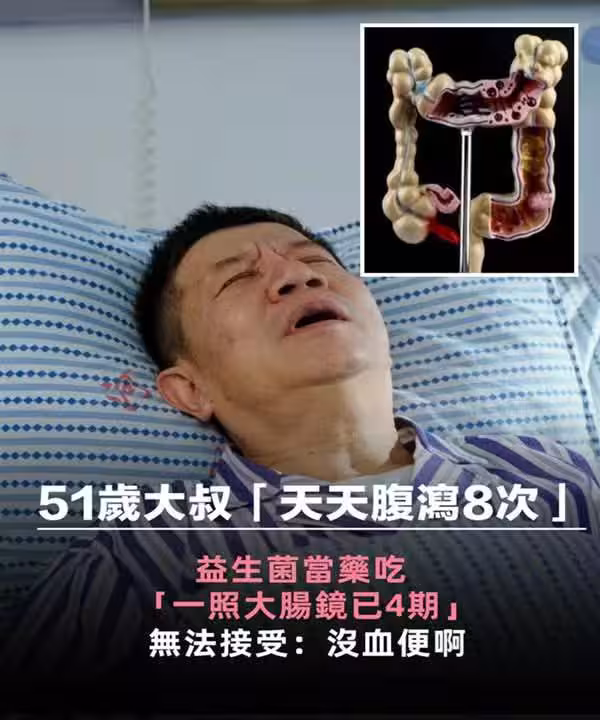 51歲大叔「天天腹瀉八次」以為腸躁症「一照大腸鏡已四期」益生菌當藥吃,無法接受:沒血便啊