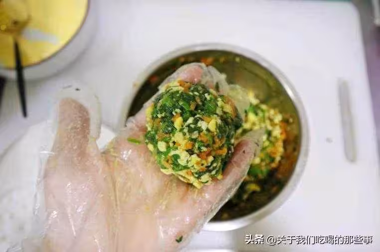 3、加入一勺玉米面,再次攪勻,用手把菜餡捏成合適大小的菜團,放進全麥粉里滾一圈,沾點水再裹一層,裹上厚厚的全麥粉。