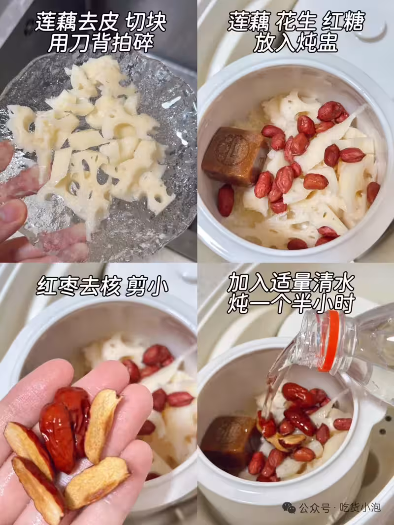 1. 蓮藕去皮後拍碎,銀耳撕成小碎塊,紅棗去核並剪小。