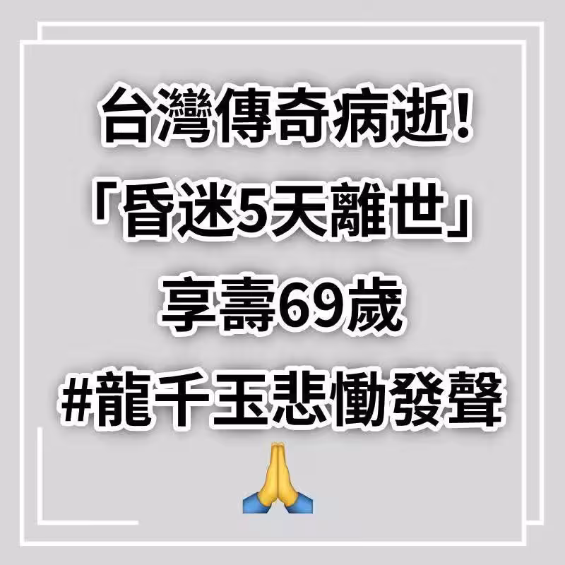 台灣傳奇病逝!驚傳「昏迷5天離世」享壽69歲 #龍千玉悲慟發聲
