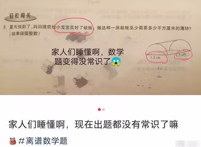 有一題問「做一床寶寶蚊帳至少需要多少平方厘米的薄紗」,結果圖上顯示長寬分別為1.