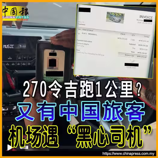 (吉隆坡20日訊)又有黑心司機痛宰中國旅客車費,這次是1公里車程收270令吉!