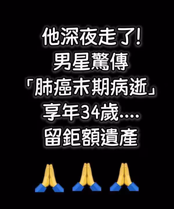 他深夜走了!男星驚傳「肺癌末期病逝」享年34歲....留鉅額遺產!