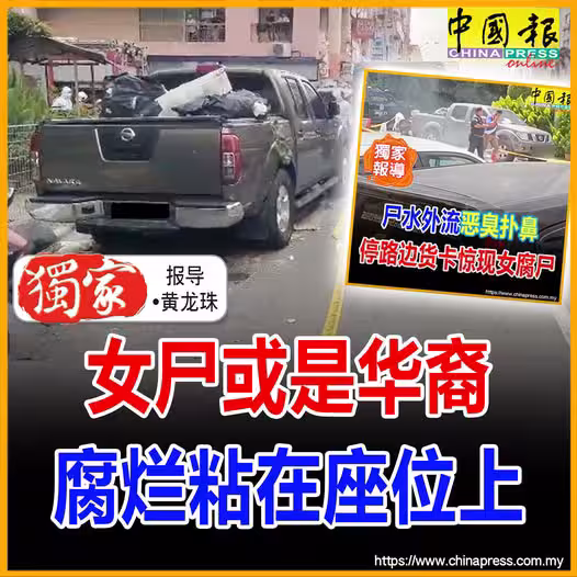 (吉隆坡23日訊/獨家報導)今早被揭斃命在貨卡的女腐屍,相信是一名華裔女子,不是貨卡車主,疑是打開沒上鎖的車門後,坐在副駕駛位子上離奇斃命;她被發現時屍體已嚴重腐爛,幾乎粘在副駕駛座位上,推測已斃命至少4天!