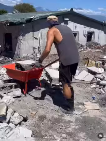 加賀美智久專業地戴上手套,搬運著裝滿土塊的紅色推車。不只這樣,他到了室內,還拿起鏟子與其他志工一起鏟泥,並用推車把泥濘、瓦礫一點一點搬出來,「到現場看到現況很難過,我們能做什麼就做什麼!主要是挖泥土,搬泥土。」