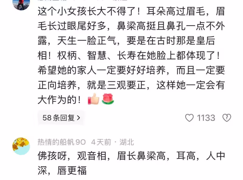 也有人誇她耳高人中深,鼻樑高眉長,嘴巴更是有福氣,是個有佛性的孩子,妥妥的「觀音相」。