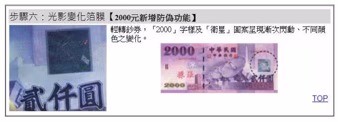 2000元新增加的防偽功能:2000元鈔票在特定角度下,其箔膜及「2000」字樣、圖案呈現新次閱動,不同顏色變化。