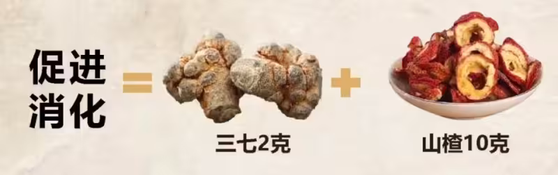 功效:山楂中含有黃酮類、三萜類物質,能促進胃蛋白酶分泌,加速脂肪分解;三七通過調節血液循環改善胃部供血供氧狀況,緩解因食積引發的消化不良、腹脹症狀。