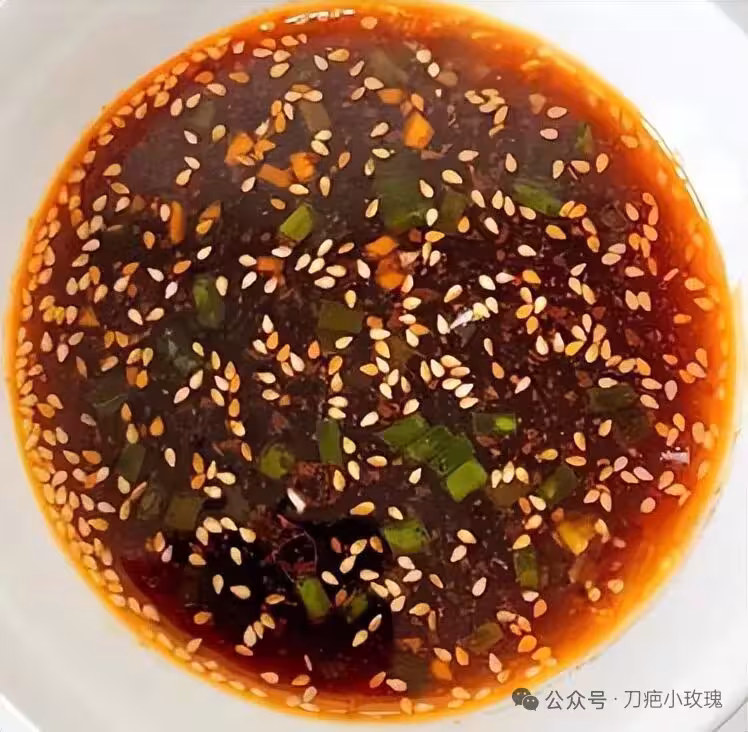 1️⃣辣椒麵+白芝麻+蒜末+蔥花淋熱油