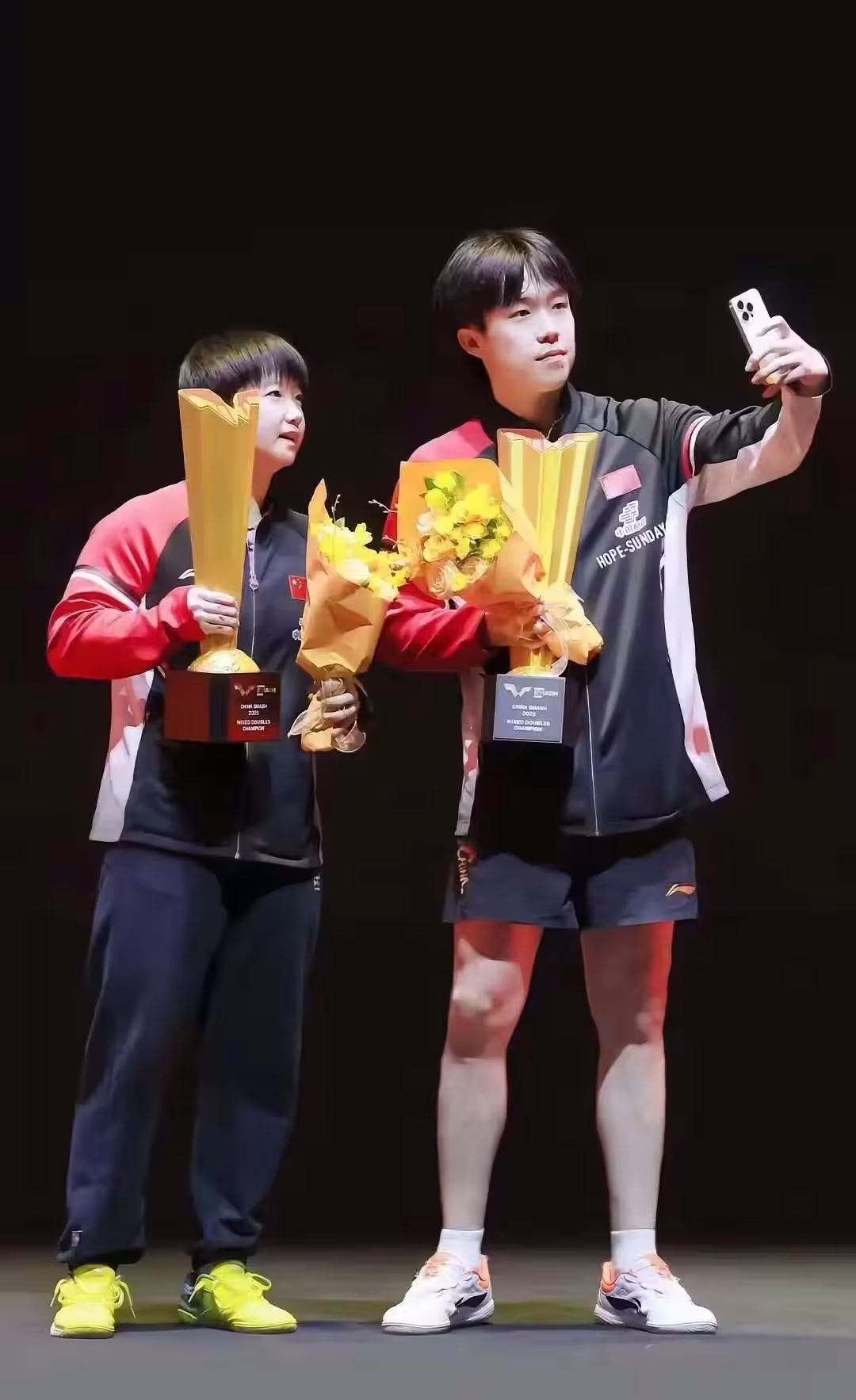 再比如說,當混雙奪冠,來到合影環節的時候,王楚欽是主動的拿過相機,露出了笑容,和孫穎莎完成了合照,用球迷的話說,雖然王楚欽已經努力的壓制自己了,可是嘴角的笑容實在是壓不住啊。